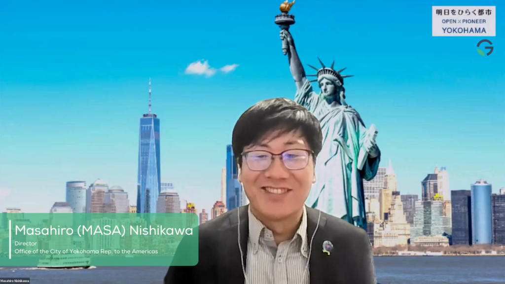 Masahiro Nishikawa, Director of the Office of the City of Yokohama Representative to the Americas, opened the session with an overview of Yokohama’s role as a gateway city connecting global climate innovation with Japan’s industrial ecosystem. Yokohama, Japan’s second-largest city with 3.7 million residents located 30 minutes from Tokyo, hosts over 160,000 researchers and engineers and combines scale, livability, and innovation with a long history of international collaboration.